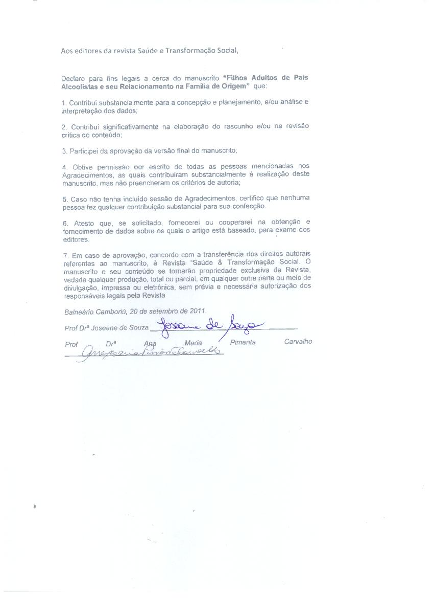 7. Em caso de aprovação, concordo com a transferência dos direitos autorais referentes ao manuscrito, à Revista "Saúde & Transformação Social. O manuscrito e seu conteúdo se tornarão propriedade exclusiva da Revista, vedada qualquer produção, total ou parcial, em qualquer outra parte ou meio de divulgação, impressa ou eletrônica, sem prévia e necessária autorização dos responsáveis legais pela Revista