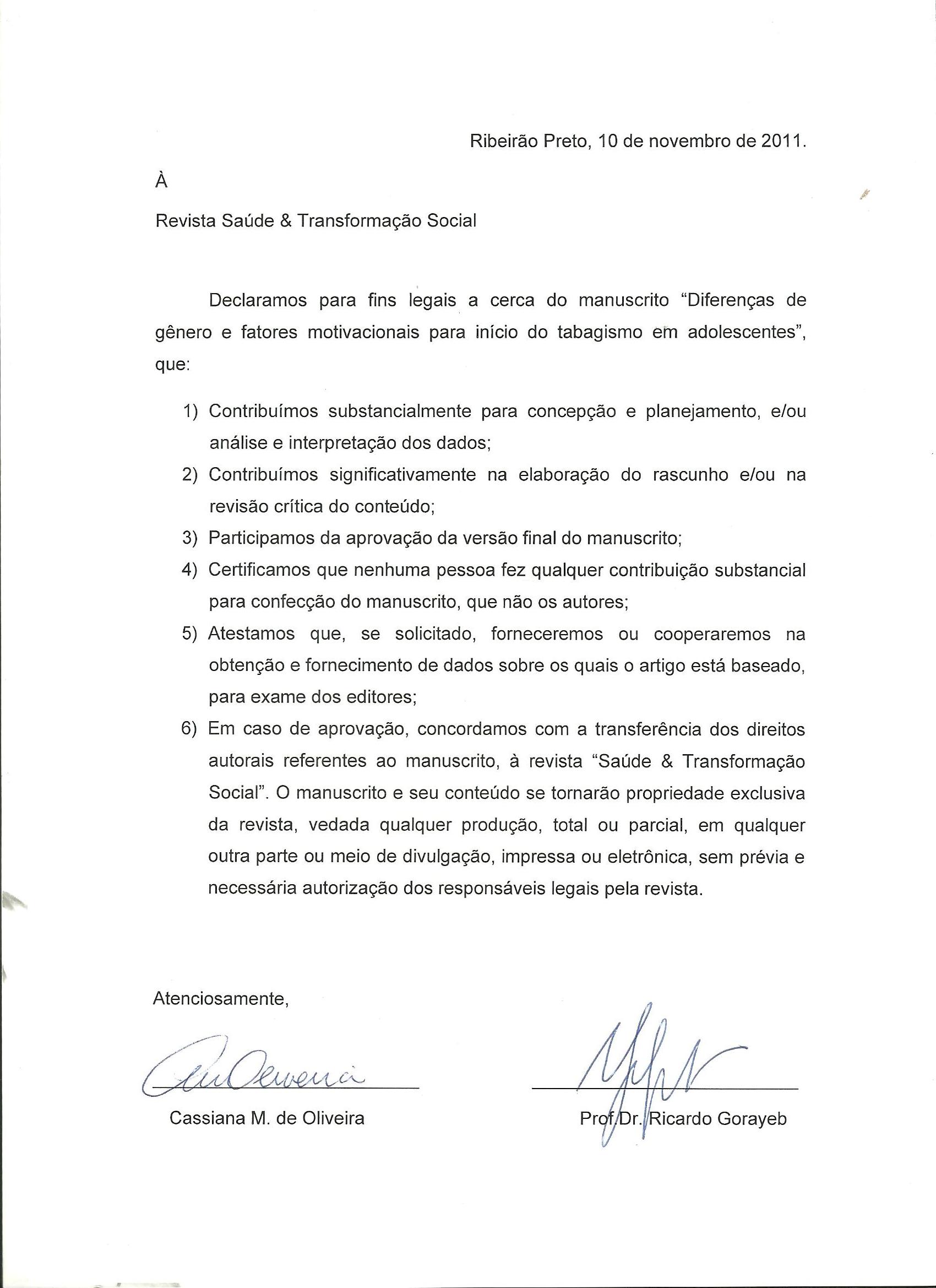 7. Em caso de aprovação, concordo com a transferência dos direitos autorais referentes ao manuscrito, à Revista "Saúde & Transformação Social. O manuscrito e seu conteúdo se tornarão propriedade exclusiva da Revista, vedada qualquer produção, total ou parcial, em qualquer outra parte ou meio de divulgação, impressa ou eletrônica, sem prévia e necessária autorização dos responsáveis legais pela Revista