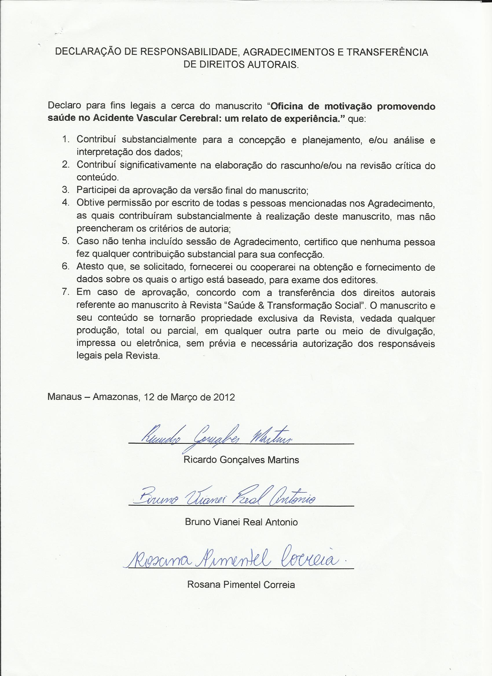 Da submissão, os autores deverão encaminhar cópia digitalizada do seguinte documento assinados por todos os autores do manuscrito, conforme modelo que se segue, nos documentos suplementares que constam no processo de submissão.