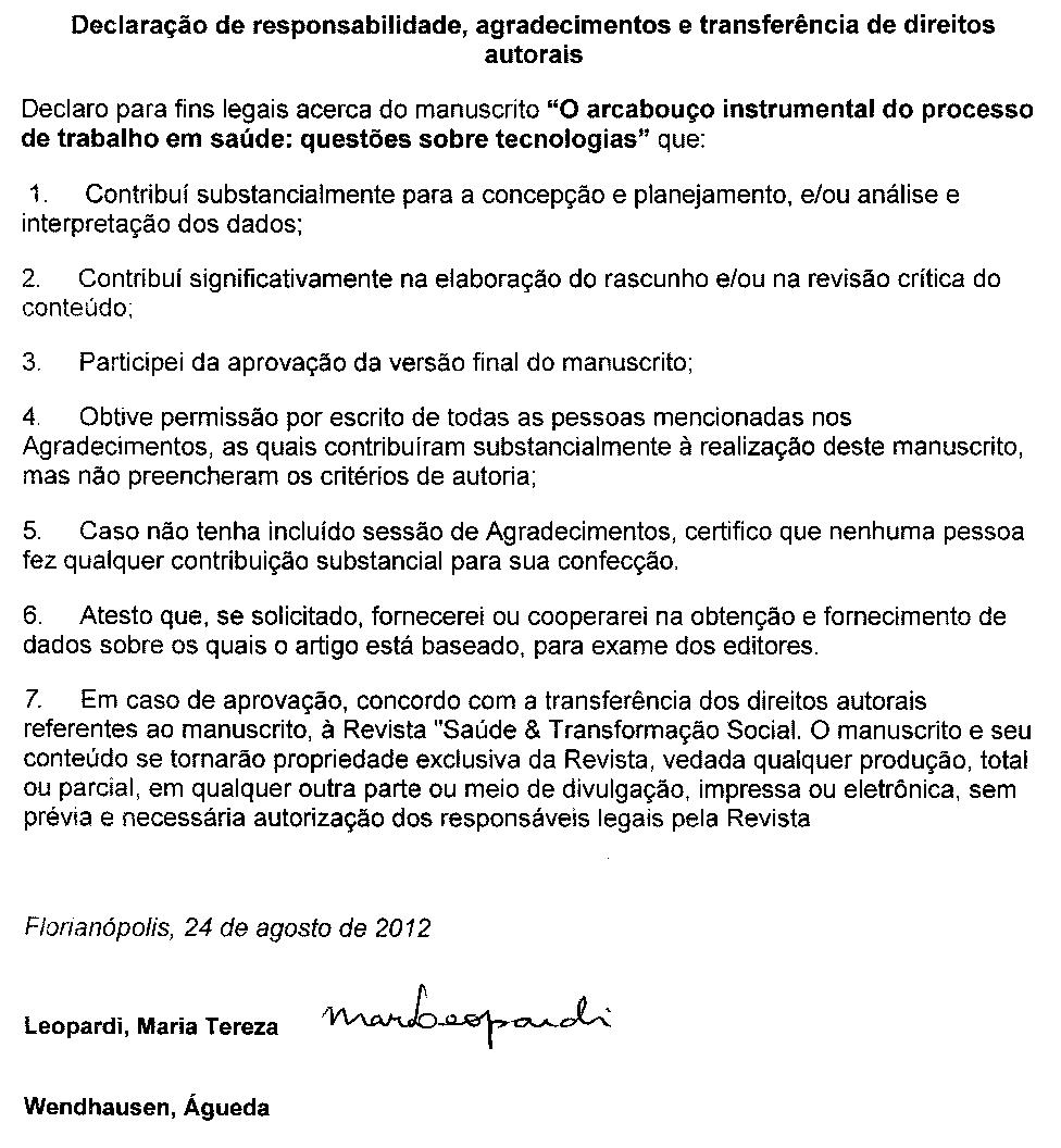 7. Em caso de aprovação, concordo com a transferência dos direitos autorais referentes ao manuscrito, à Revista "Saúde & Transformação Social. O manuscrito e seu conteúdo se tornarão propriedade exclusiva da Revista, vedada qualquer produção, total ou parcial, em qualquer outra parte ou meio de divulgação, impressa ou eletrônica, sem prévia e necessária autorização dos responsáveis legais pela Revista