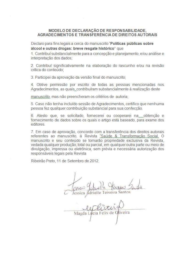 Da submissão, os autores deverão encaminhar cópia digitalizada do seguinte documento assinados por todos os autores do manuscrito, conforme modelo que se segue, nos documentos suplementares que constam no processo de submissão.
