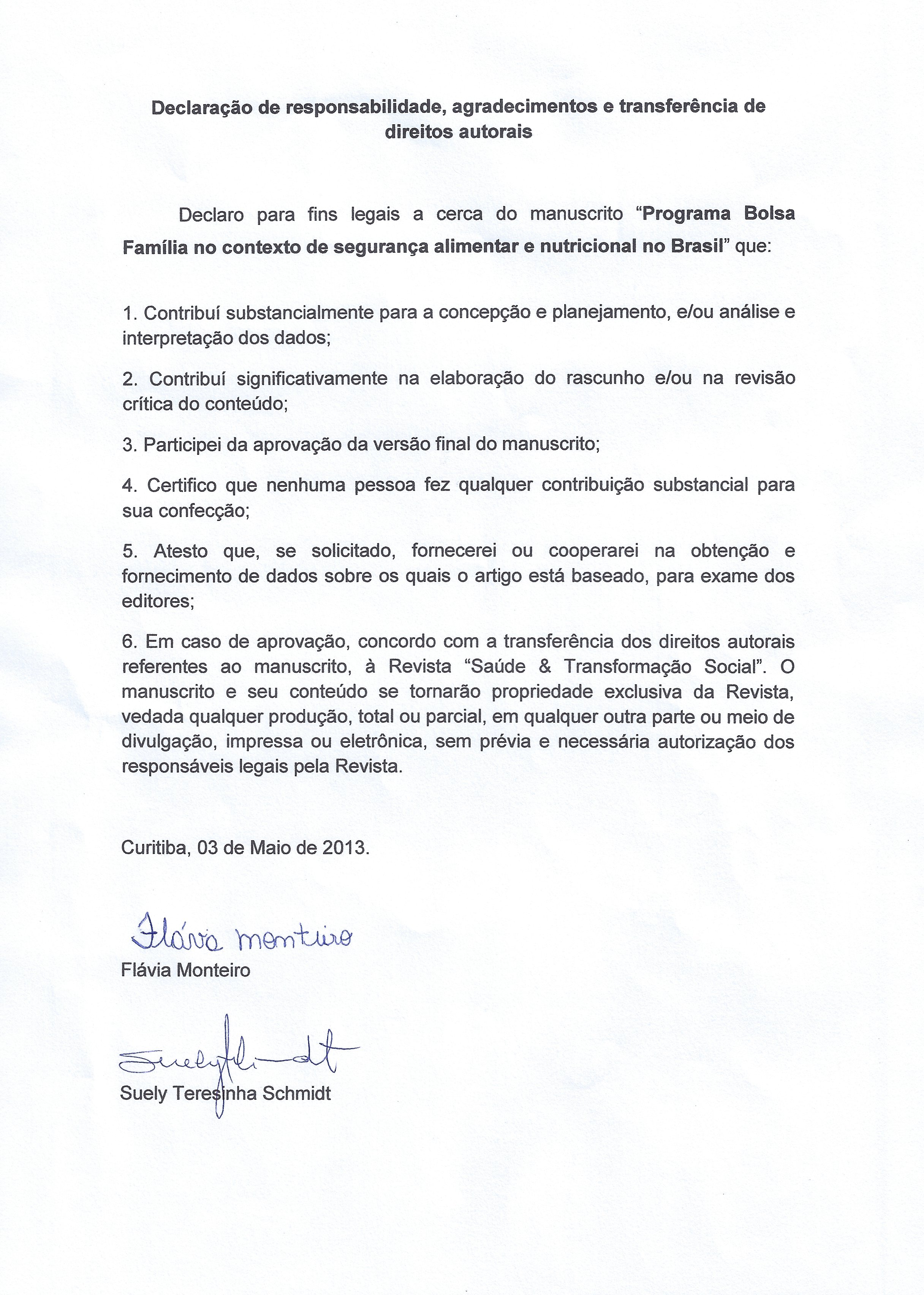 7. Em caso de aprovação, concordo com a transferência dos direitos autorais referentes ao manuscrito, à Revista "Saúde & Transformação Social. O manuscrito e seu conteúdo se tornarão propriedade exclusiva da Revista, vedada qualquer produção, total ou parcial, em qualquer outra parte ou meio de divulgação, impressa ou eletrônica, sem prévia e necessária autorização dos responsáveis legais pela Revista