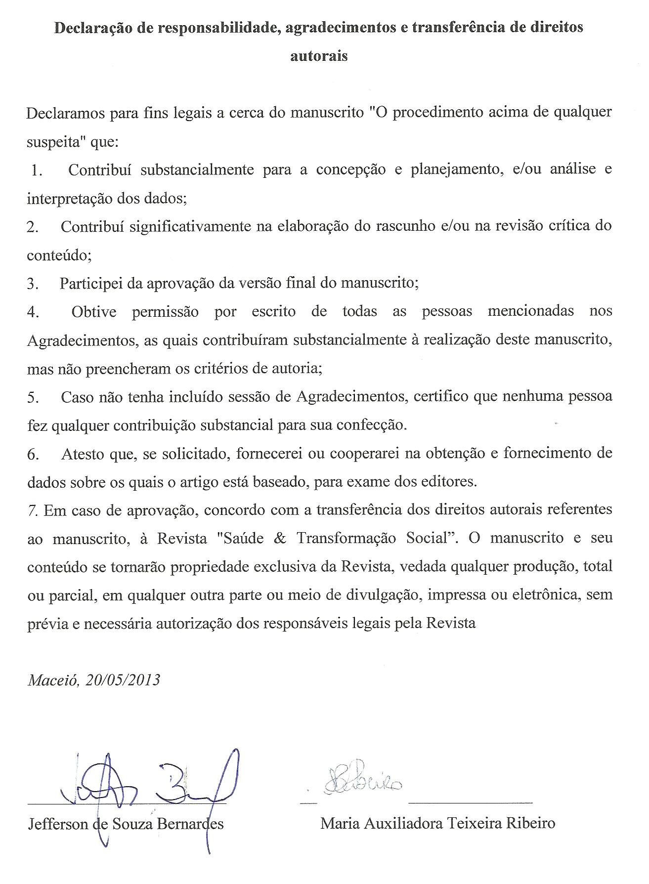 Da submissão, os autores deverão encaminhar cópia digitalizada do seguinte documento assinados por todos os autores do manuscrito, conforme modelo que se segue, nos documentos suplementares que constam no processo de submissão.