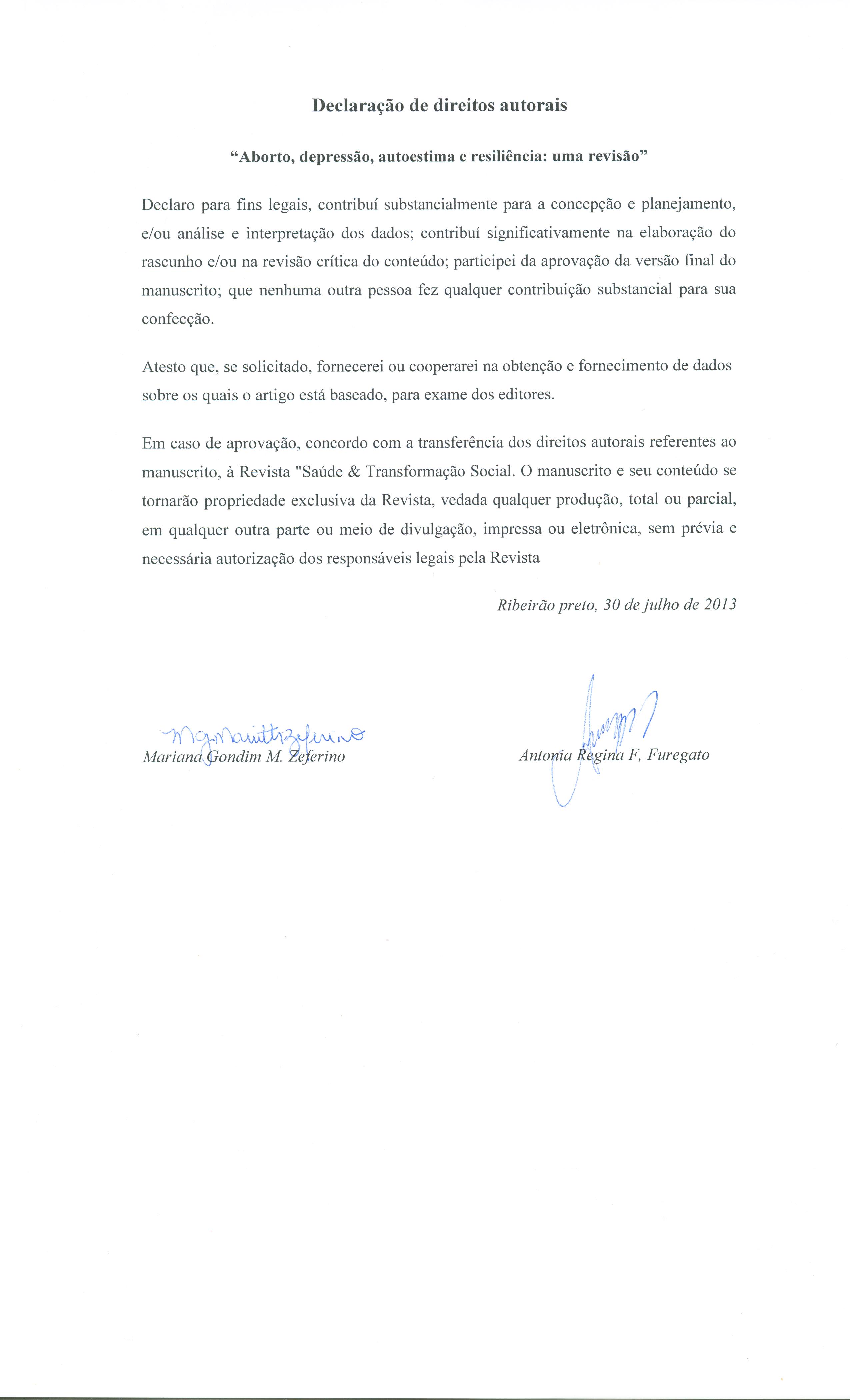 7. Em caso de aprovação, concordo com a transferência dos direitos autorais referentes ao manuscrito, à Revista "Saúde & Transformação Social. O manuscrito e seu conteúdo se tornarão propriedade exclusiva da Revista, vedada qualquer produção, total ou parcial, em qualquer outra parte ou meio de divulgação, impressa ou eletrônica, sem prévia e necessária autorização dos responsáveis legais pela Revista