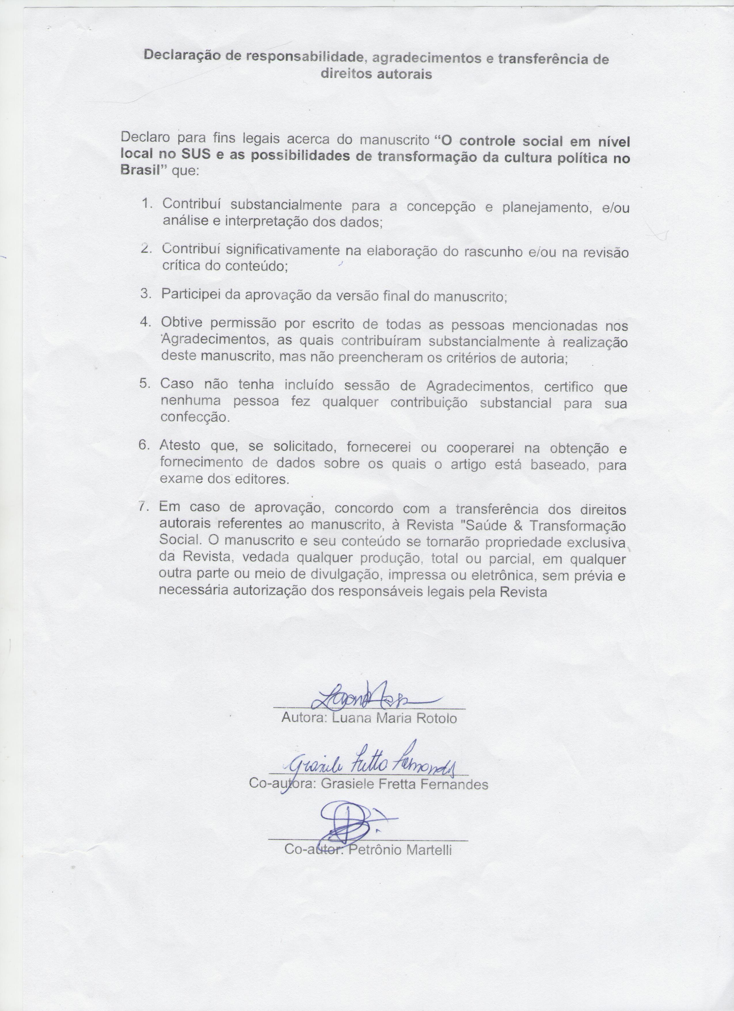 7. Em caso de aprovação, concordo com a transferência dos direitos autorais referentes ao manuscrito, à Revista "Saúde & Transformação Social. O manuscrito e seu conteúdo se tornarão propriedade exclusiva da Revista, vedada qualquer produção, total ou parcial, em qualquer outra parte ou meio de divulgação, impressa ou eletrônica, sem prévia e necessária autorização dos responsáveis legais pela Revista
