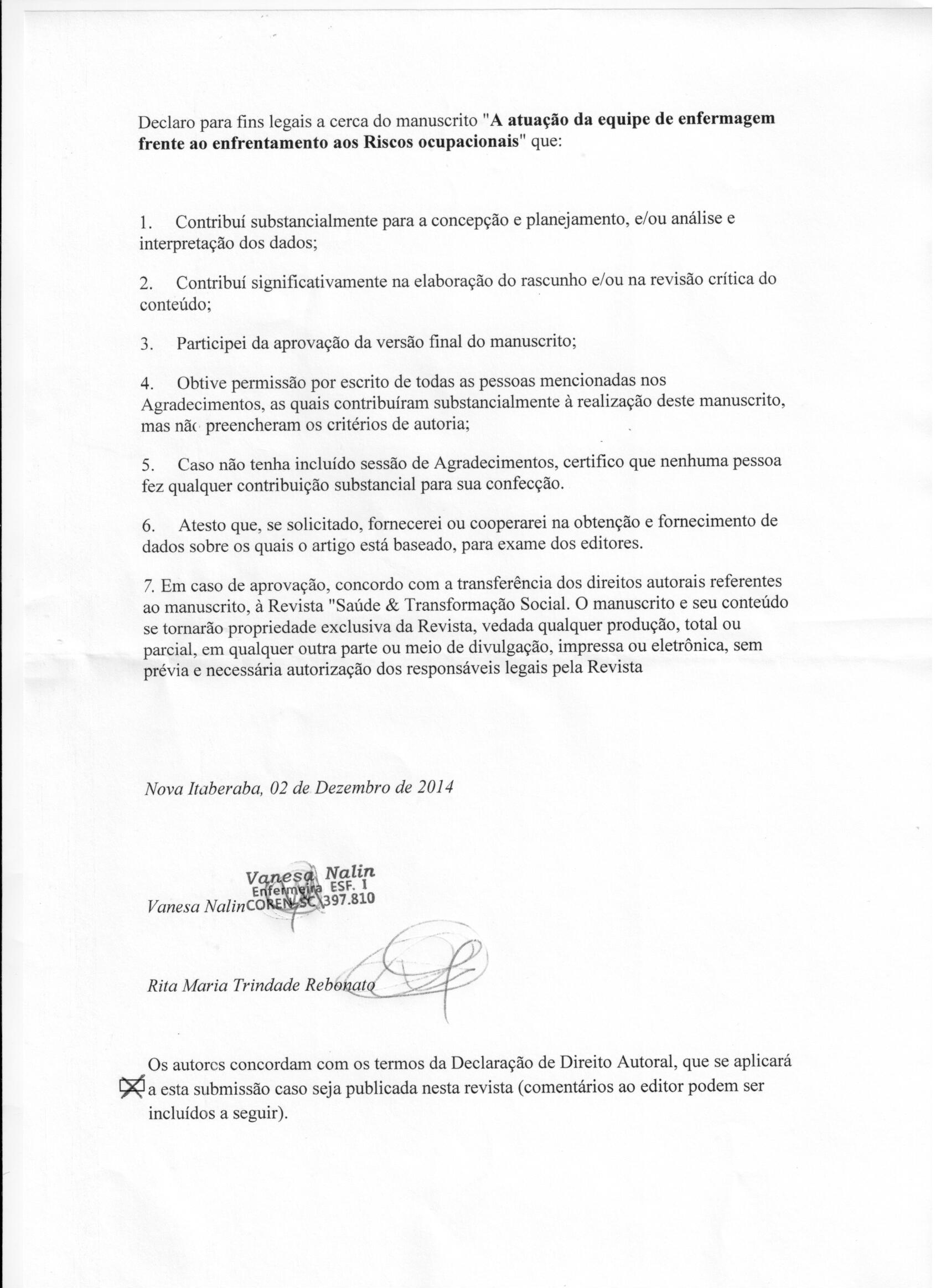 7. Em caso de aprovação, concordo com a transferência dos direitos autorais referentes ao manuscrito, à Revista "Saúde & Transformação Social. O manuscrito e seu conteúdo se tornarão propriedade exclusiva da Revista, vedada qualquer produção, total ou parcial, em qualquer outra parte ou meio de divulgação, impressa ou eletrônica, sem prévia e necessária autorização dos responsáveis legais pela Revista