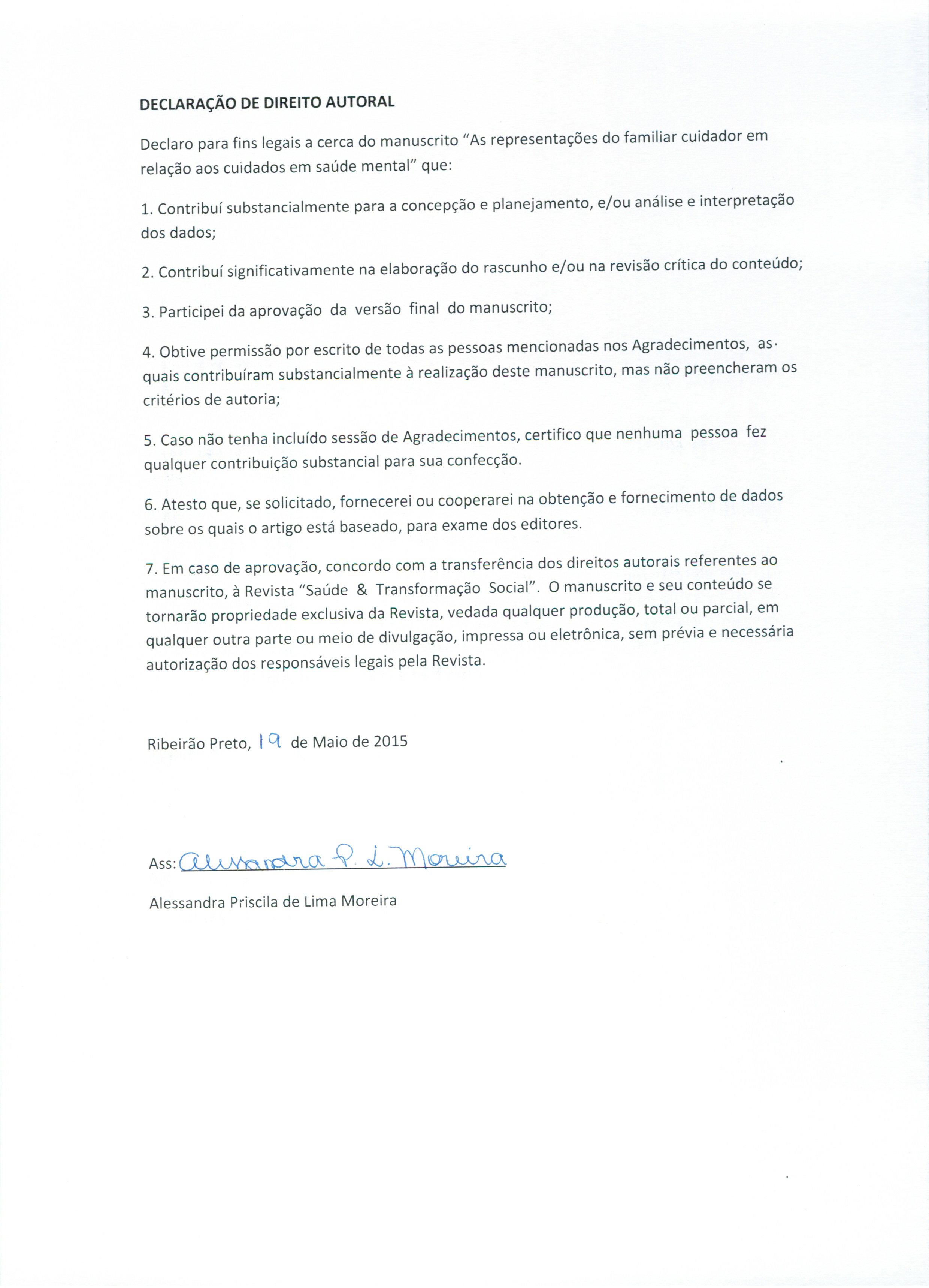 7. Em caso de aprovação, concordo com a transferência dos direitos autorais referentes ao manuscrito, à Revista "Saúde & Transformação Social. O manuscrito e seu conteúdo se tornarão propriedade exclusiva da Revista, vedada qualquer produção, total ou parcial, em qualquer outra parte ou meio de divulgação, impressa ou eletrônica, sem prévia e necessária autorização dos responsáveis legais pela Revista