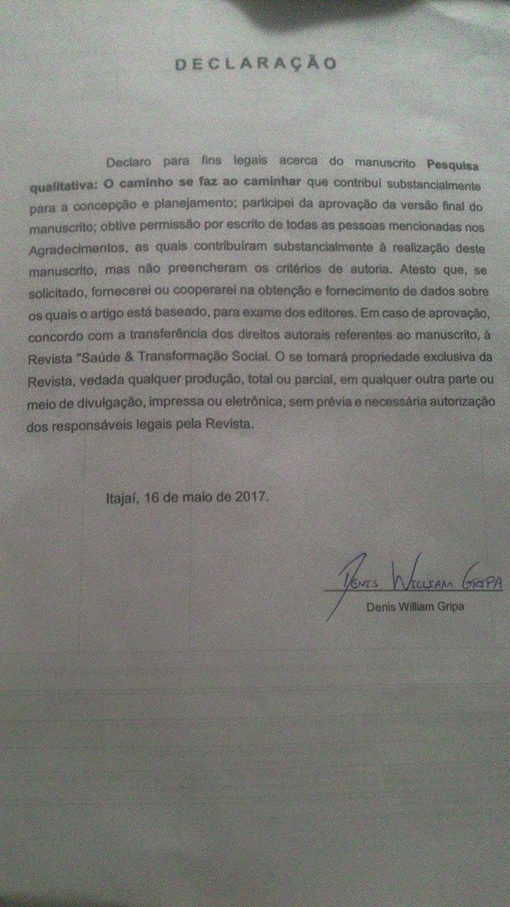 7. Em caso de aprovação, concordo com a transferência dos direitos autorais referentes ao manuscrito, à Revista "Saúde & Transformação Social. O manuscrito e seu conteúdo se tornarão propriedade exclusiva da Revista, vedada qualquer produção, total ou parcial, em qualquer outra parte ou meio de divulgação, impressa ou eletrônica, sem prévia e necessária autorização dos responsáveis legais pela Revista