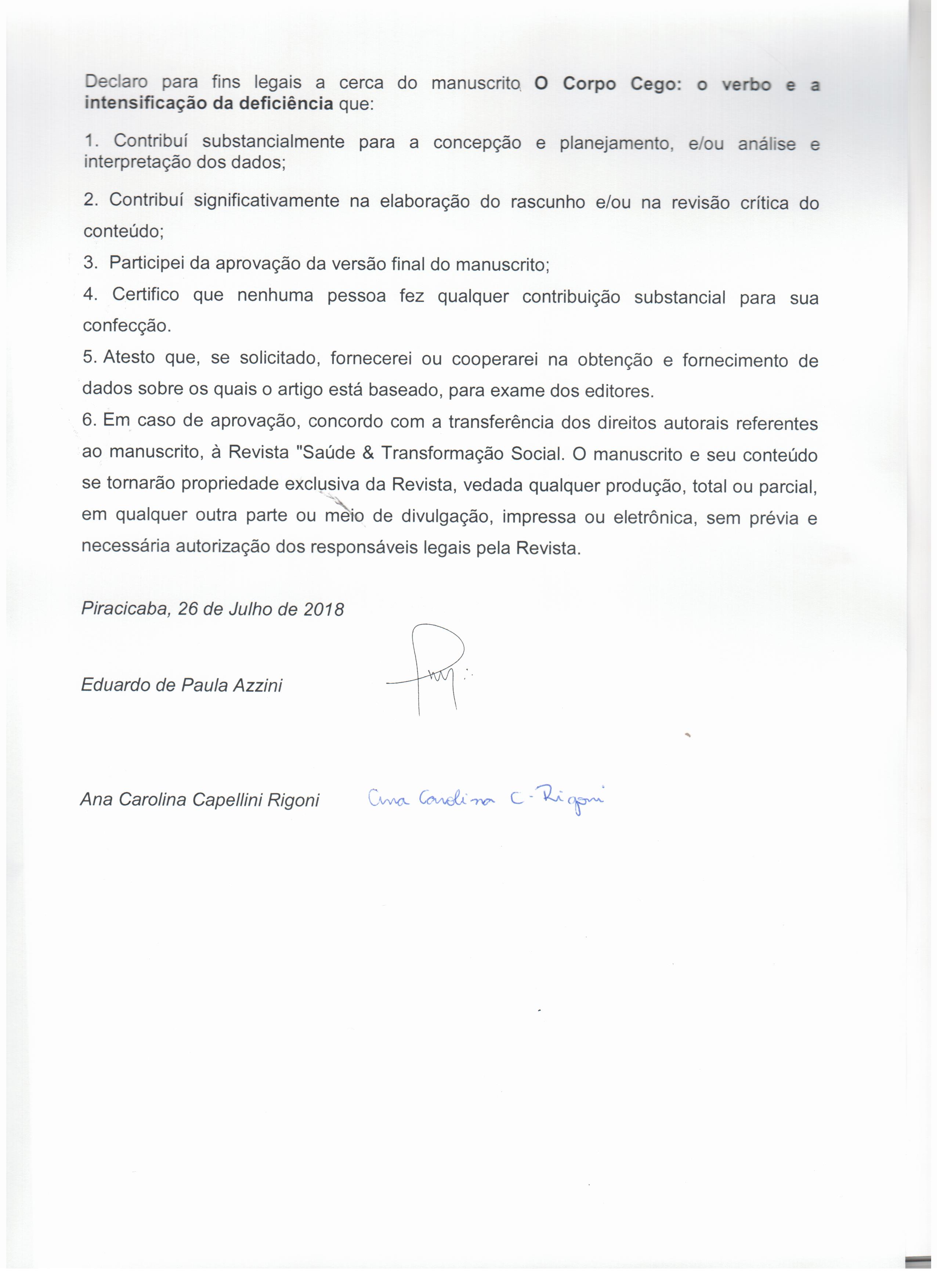 Da submissão, os autores deverão encaminhar cópia digitalizada do seguinte documento assinados por todos os autores do manuscrito, conforme modelo que se segue, nos documentos suplementares que constam no processo de submissão.